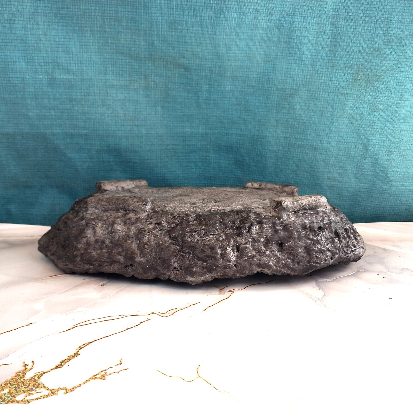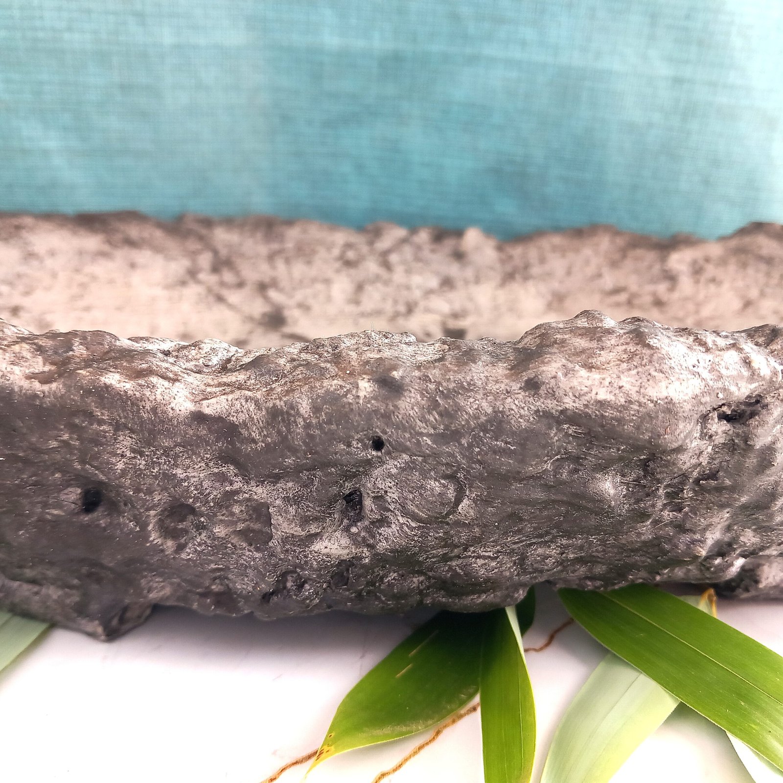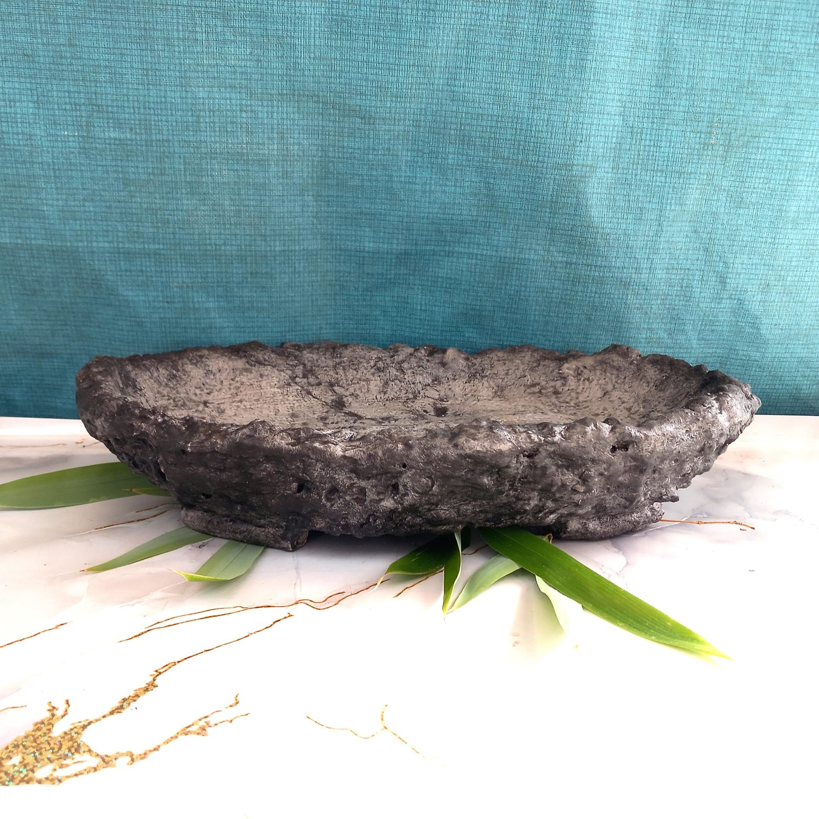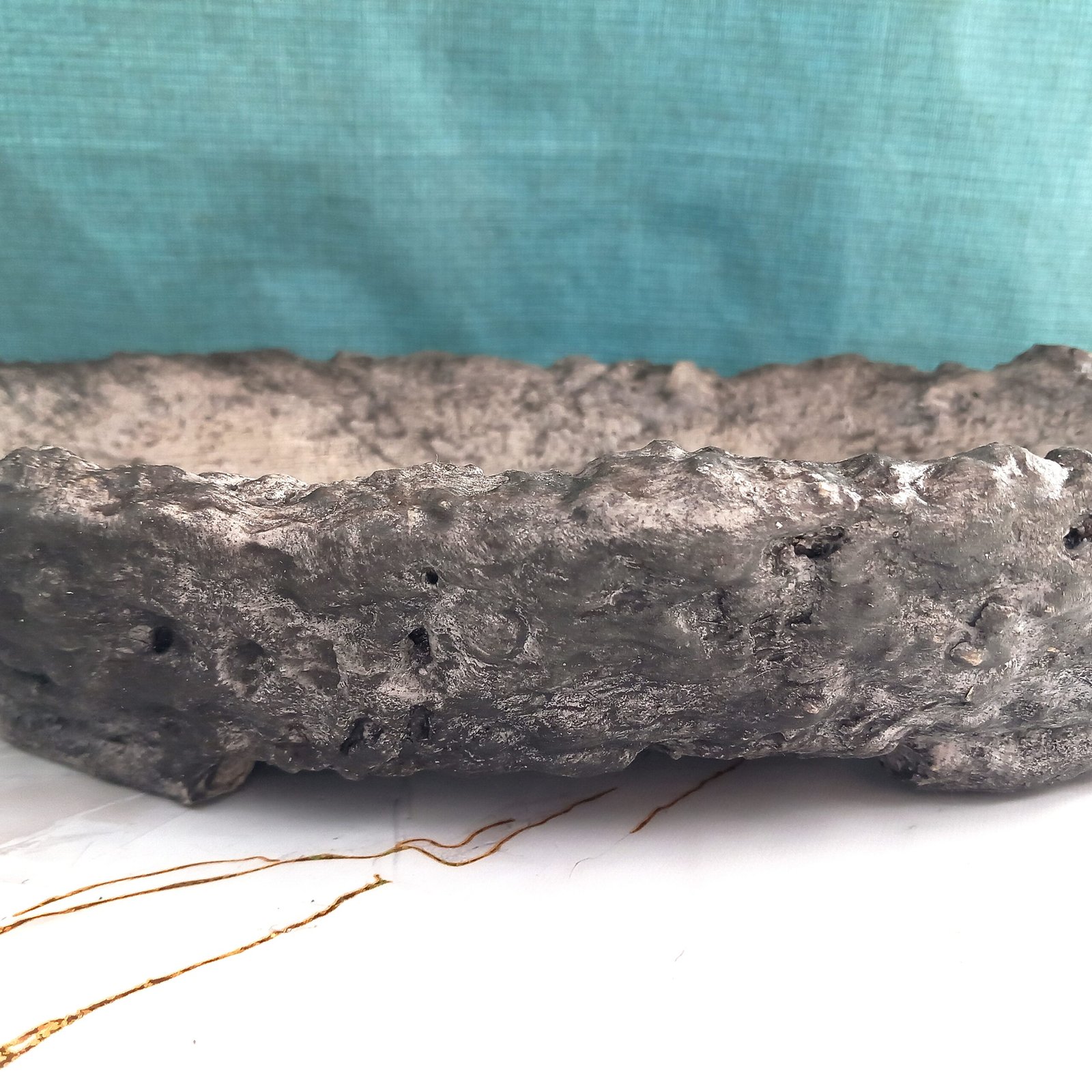 Sa forme ovale et basse , ses contours irréguliers, sa couleur et sa texture de rocher sont parfaits pour accueillir un Bonsaï ou une forêt de petits arbres.